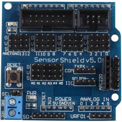 La carte d'extension du capteur Arduino Shield V5.0 Sensor qui prend en charge différents types d'interfaces, telles que IIC / interface COM, interface de communication de module Bluetooth, SD interface de communication de module de carte, APC220 modules d'interface de communication RF sans fil, RB URF V2.0 interface de capteurs à ultrasons et peut être entièrement compatible avec Arduino UNO, LEONARDO Mega, etc...